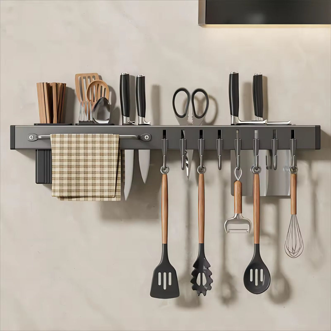 Wall-Mounted Kitchen Knife and Utensil Organizer Rack is designed to keep your knives, cooking tools, and daily essentials perfectly arranged while freeing up valuable counter space. No more messy drawers or cluttered countertops - just a clean, modern, and efficient kitchen setup. Whether you cook daily or simply prefer an organized space, this rack keeps everything within easy reach while adding a sleek and modern touch to your kitchen wall.